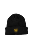 Schwarzes Flap Beanie mit Frankfurt-Adler-Patch auf der Vorderseite und FFWL-Patch auf der Rückseite.